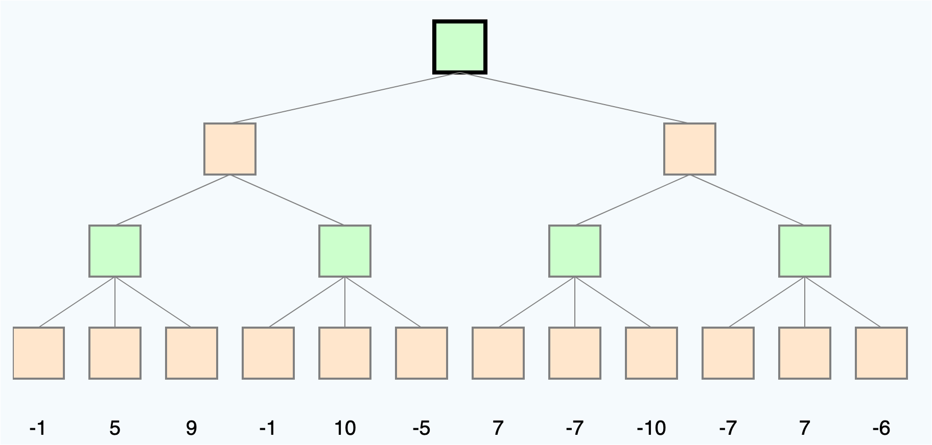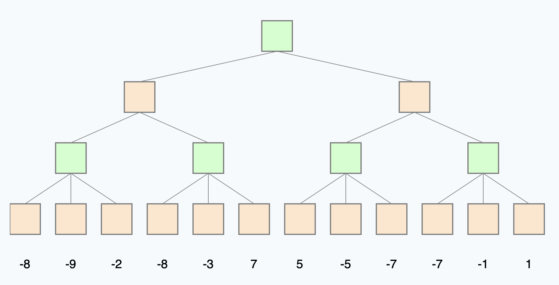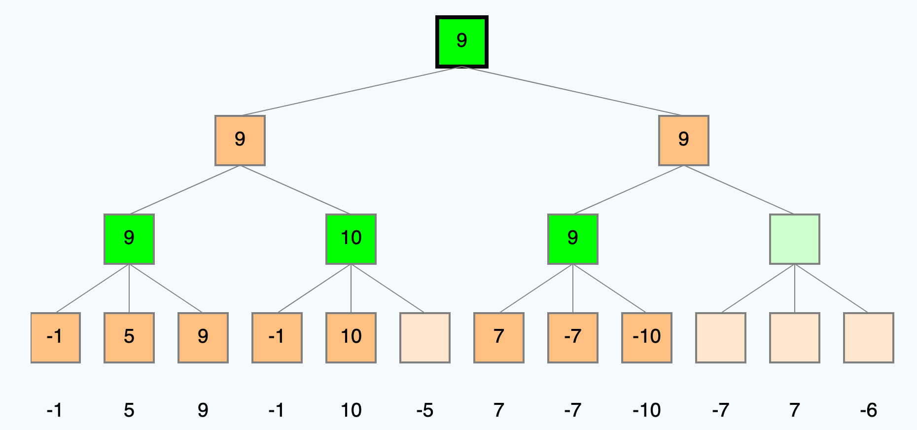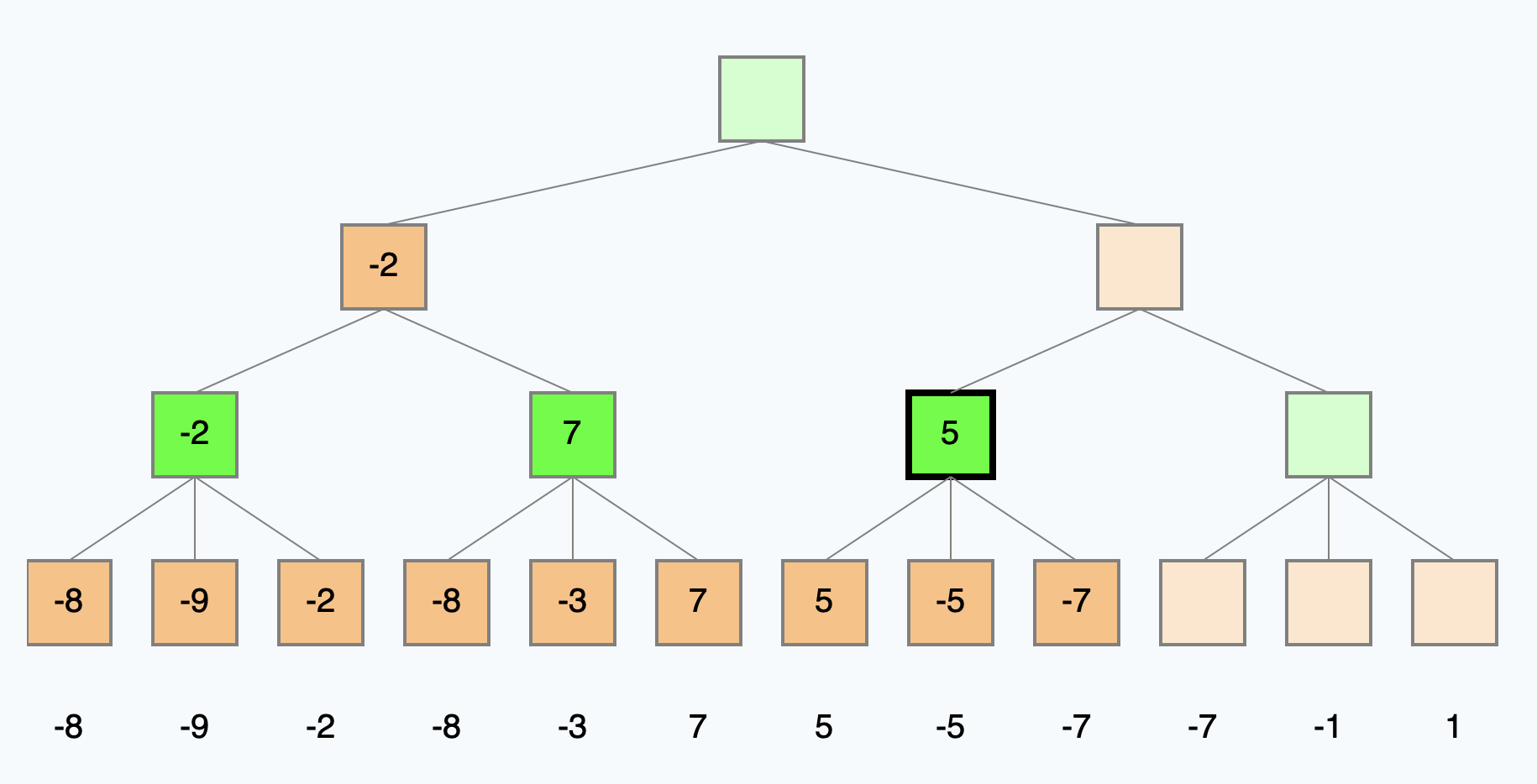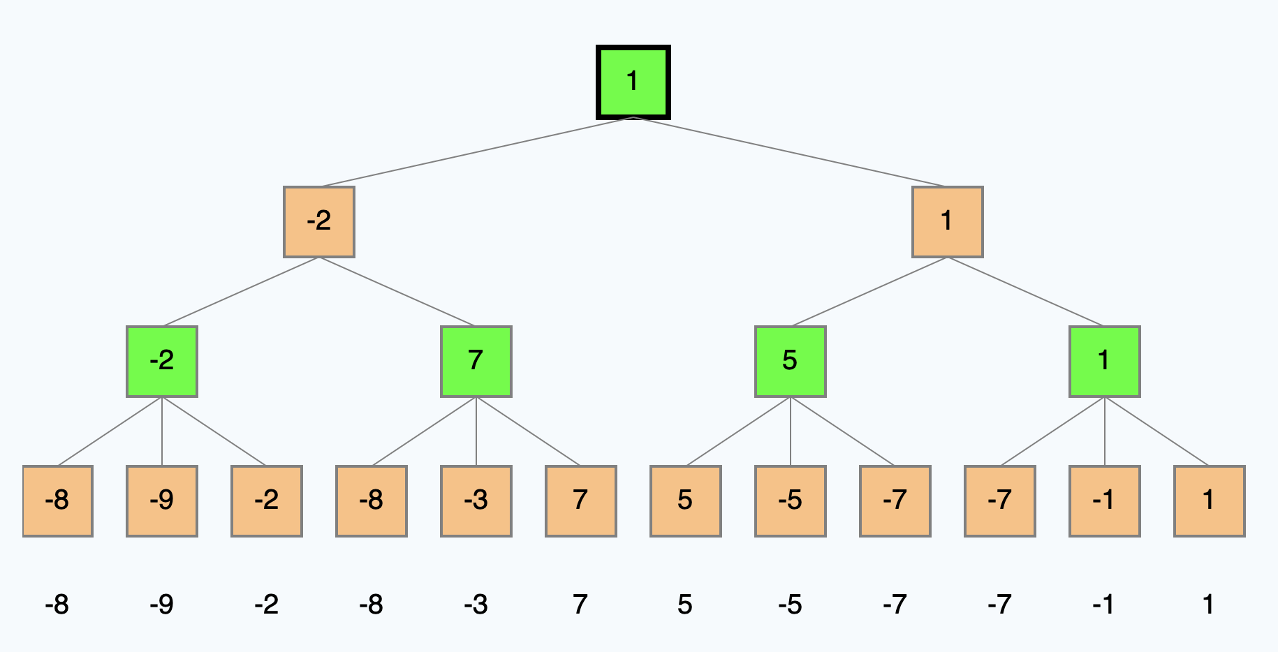 Nun kann der Algorithmus die Bewertung zurückrechnen: Ist der Spieler am Zug, wird der grösste Wert der möglichen Werte (max) übernommen (entspricht dem besten Zug des Spielers). Ist der Gegner am Zug, dann wird der kleinste Wert (min) übernommen (entspricht dem besten Zug des Gegners).