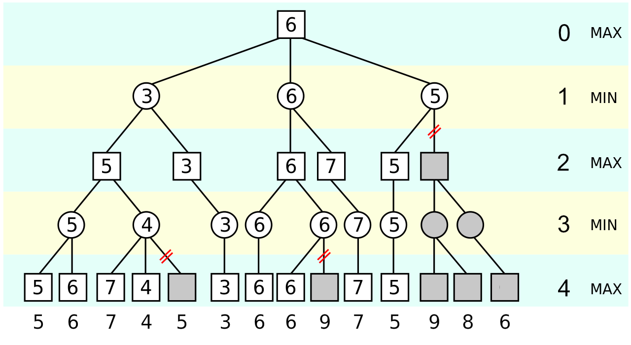 - Beide minimierende Äste in Ebene 3 liefern eine 6. Die Ebene 2 übernimmt eine 6, egal ob der rechte Ast eine kleinere Zahl liefern würde.