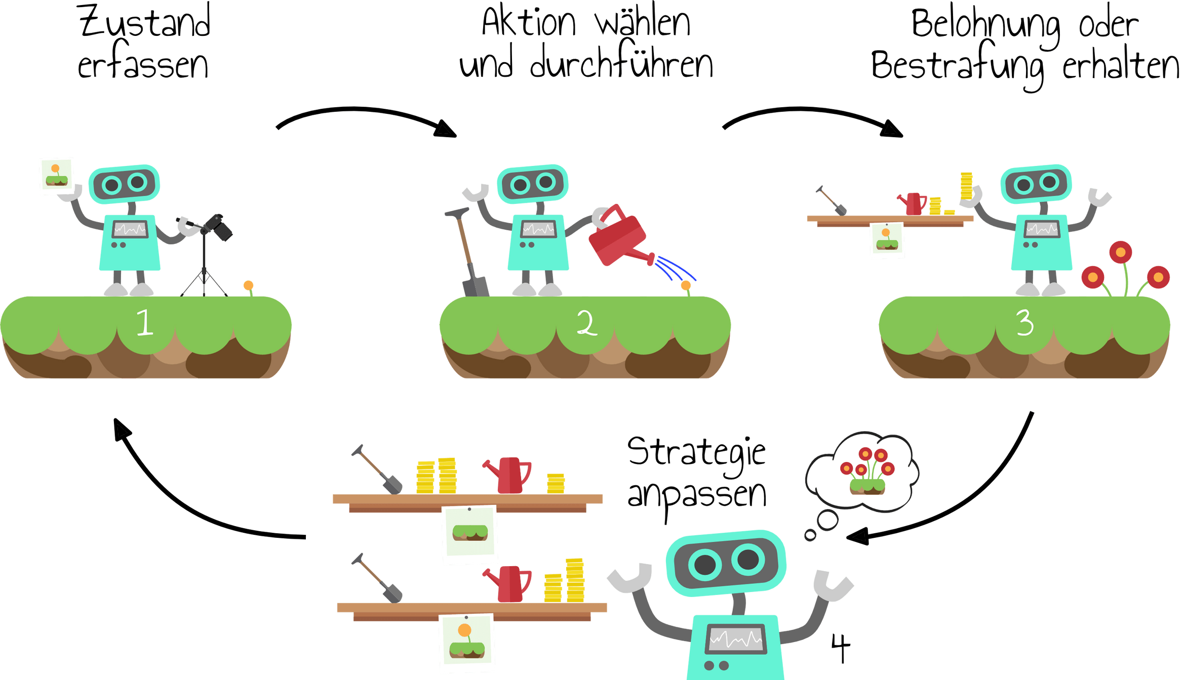 Beim – durch die Psychologie inspirierten – reinforcement learning wird der Agent (das zu autonomen Verhalten fähige Programm) wiederholt für seine Tat belohnt oder bestraft. So lernt er die Erfolgsaussichten seiner Taten besser einzusätzen und kann seine Strategie verbessern.