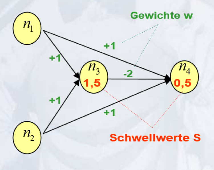 Das folgende Bild beschreibt ein mögliches solches Netz mit einer vorgegebenen Konfiguration bestehend aus fünf Gewichten zwischen den Neuronen und zwei Schwellwerten bei den Neuronen welche eine Aktivierungsfunktion haben.