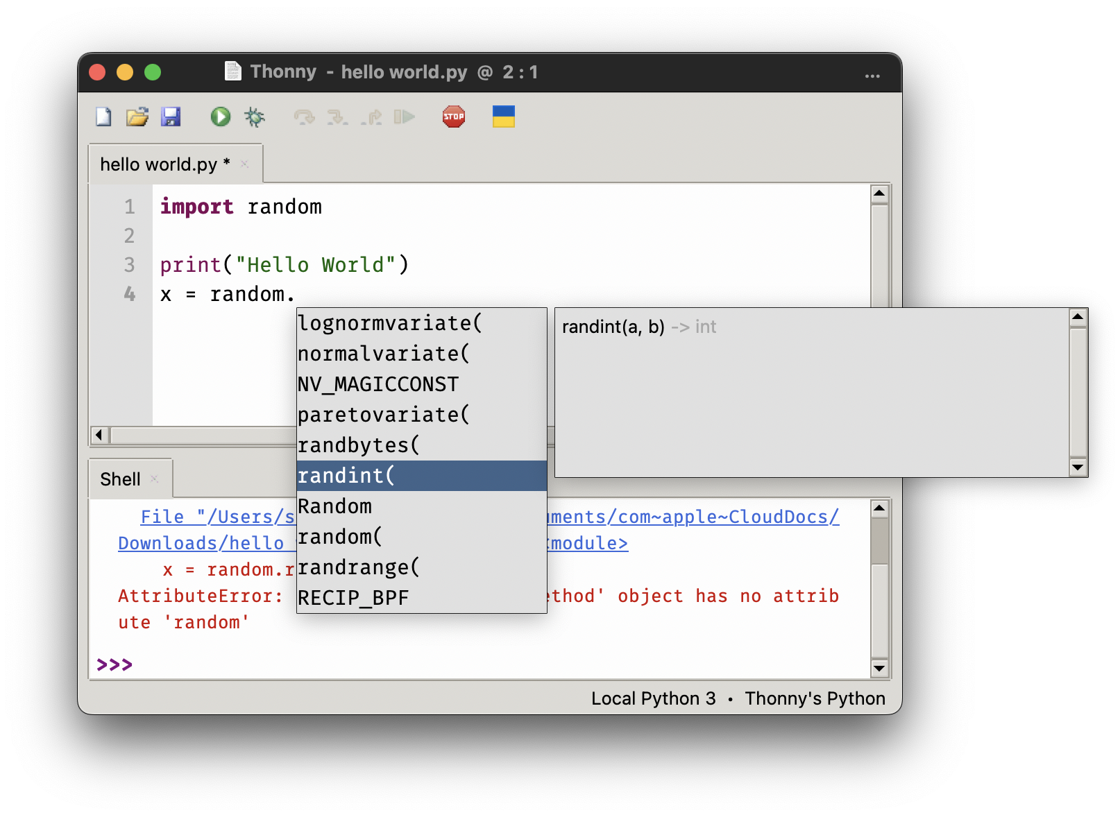 Wenn beispielsweise nach der Eingabe von random. die Vervollständigung aufgerufen wird, werden alle vorhandenen Befehle des Moduls random angezeigt: