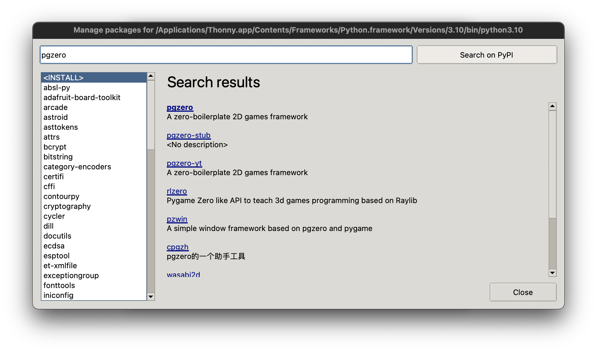Links sieht man alle installierten Packages. Oben kann gesucht werden. Suchergebnisse erscheinen im grauen Bereich und können dort durch anklicken installiert werden.