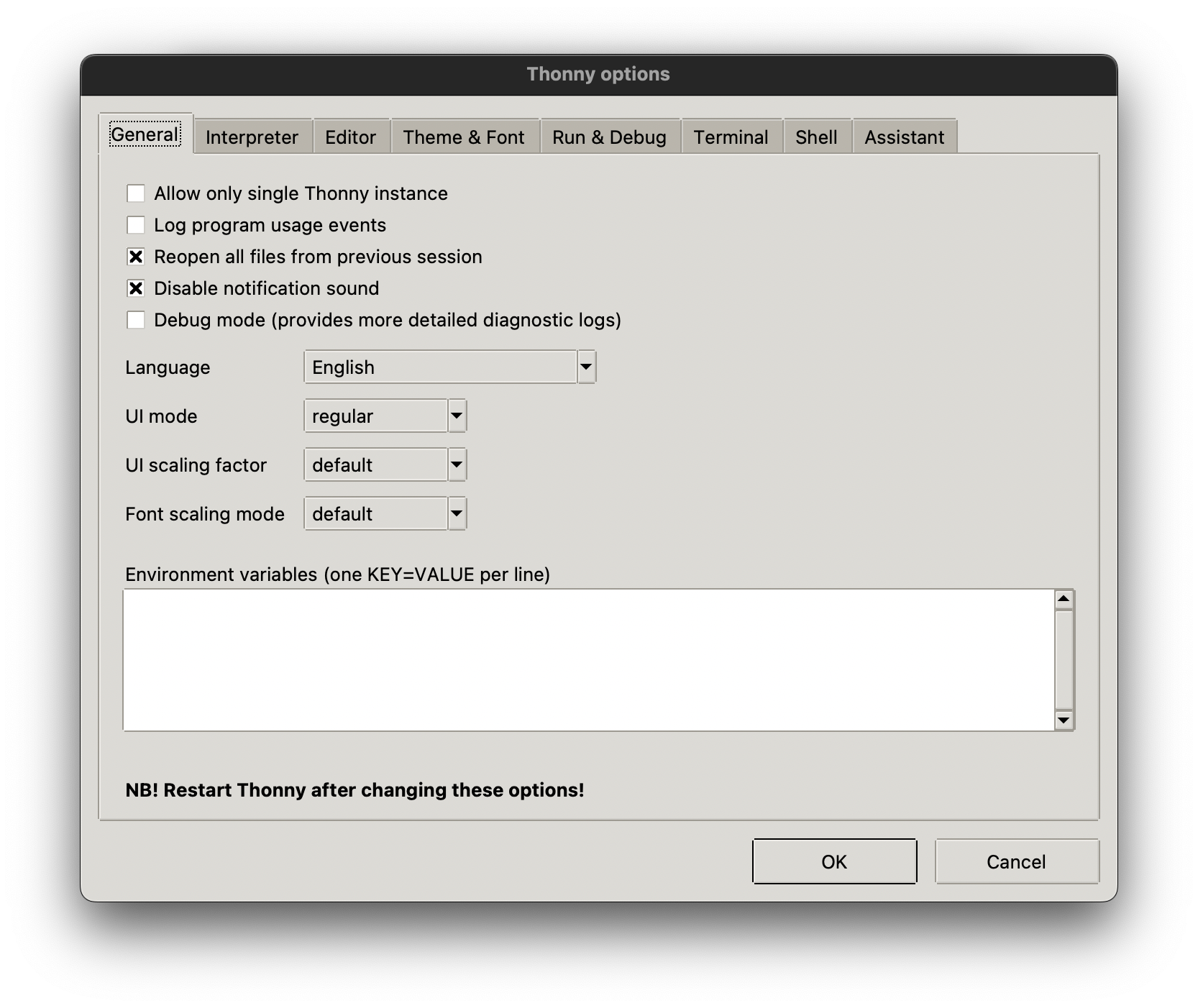 Mit dem Menüpunkt Tools 👉 Options… wird das Einstellungs-Fenster von Thonny geöffnet: