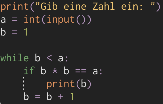 1. Es gibt die Wurzel der Zahl aus, falls eine ganzzahlige Wurzel exisitert (die Zahl eine Quadratzahl ist). Sonst wird nichts ausgegeben.