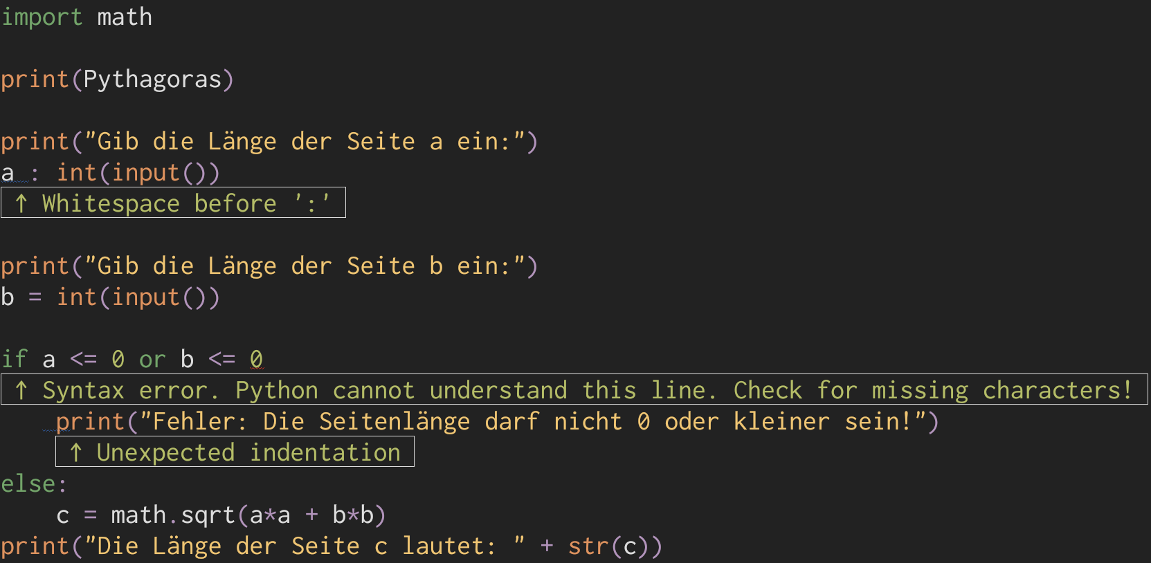 Im folgenden Programmcode verstecken sich drei Syntax-Fehler (also Rechtschreibefehler oder Tippfehler). Die angezeigten Fehlermeldungen können helfen, die Fehler zu lokalisieren. Einer der drei Fehler wurde jedoch nicht erkannt, führt aber beim Programmstart zu einem Absturz.